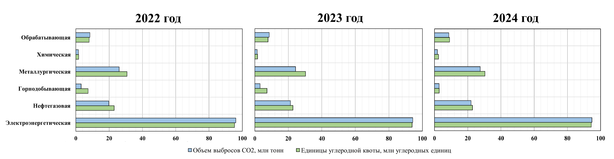 Объемы углеродных квот и выбросов CO 2, по сферам деятельности квотируемых установок