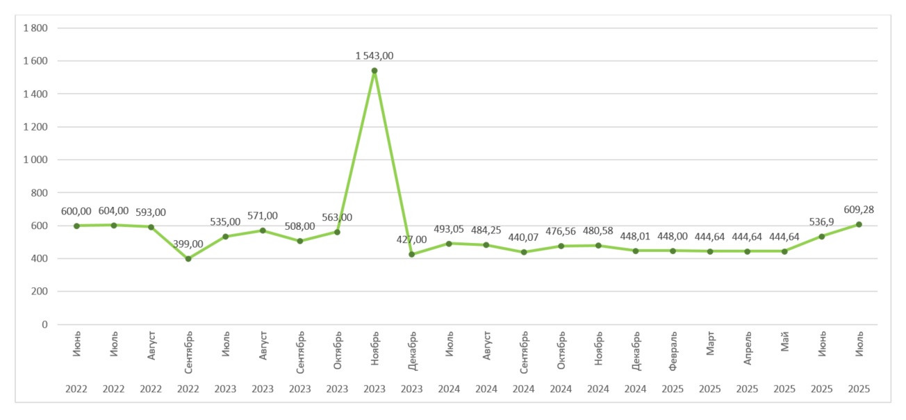 Среднемесячная цена внебиржевых сделок по купле-продаже углеродных единиц в 2025 году (в тенге за 1 углеродную единицу)