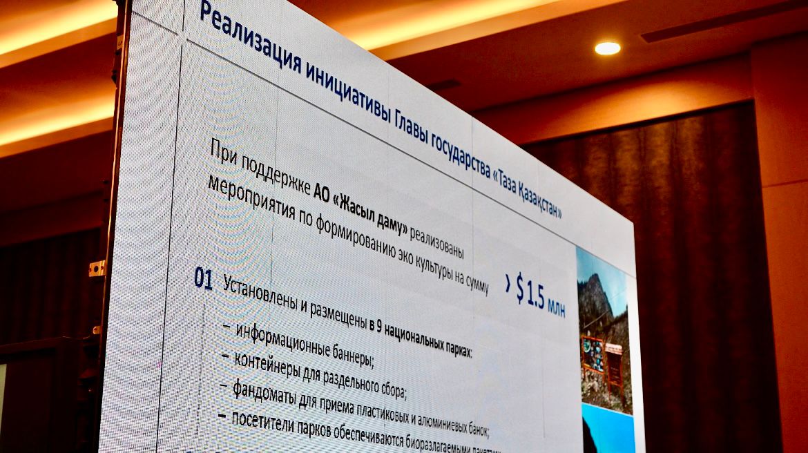 Ержан Сәрсенбай отметил, что АО «Жасыл даму» является проводником экологической политики, реализуя меры по стимулированию бизнеса в сфере переработки отходов, включая льготное финансирование инвестиционных проектов, управление бесхозяйными опасными отходами и формирование экологической культуры. Особое внимание было уделено платформе EcoQolday, обеспечивающей цифровой контроль над процессом обращения с отходами, от сбора до переработки. С момента запуска системы в августе 2024 года по июнь 2025 года с ее помощью было переработано 23,5 тыс. тонн отходов, а через приложение подключено 64 предприятия и предусмотрено порядка $35 млн на 2024–2025 годы, что обеспечивает устойчивую поддержку участников рынка.