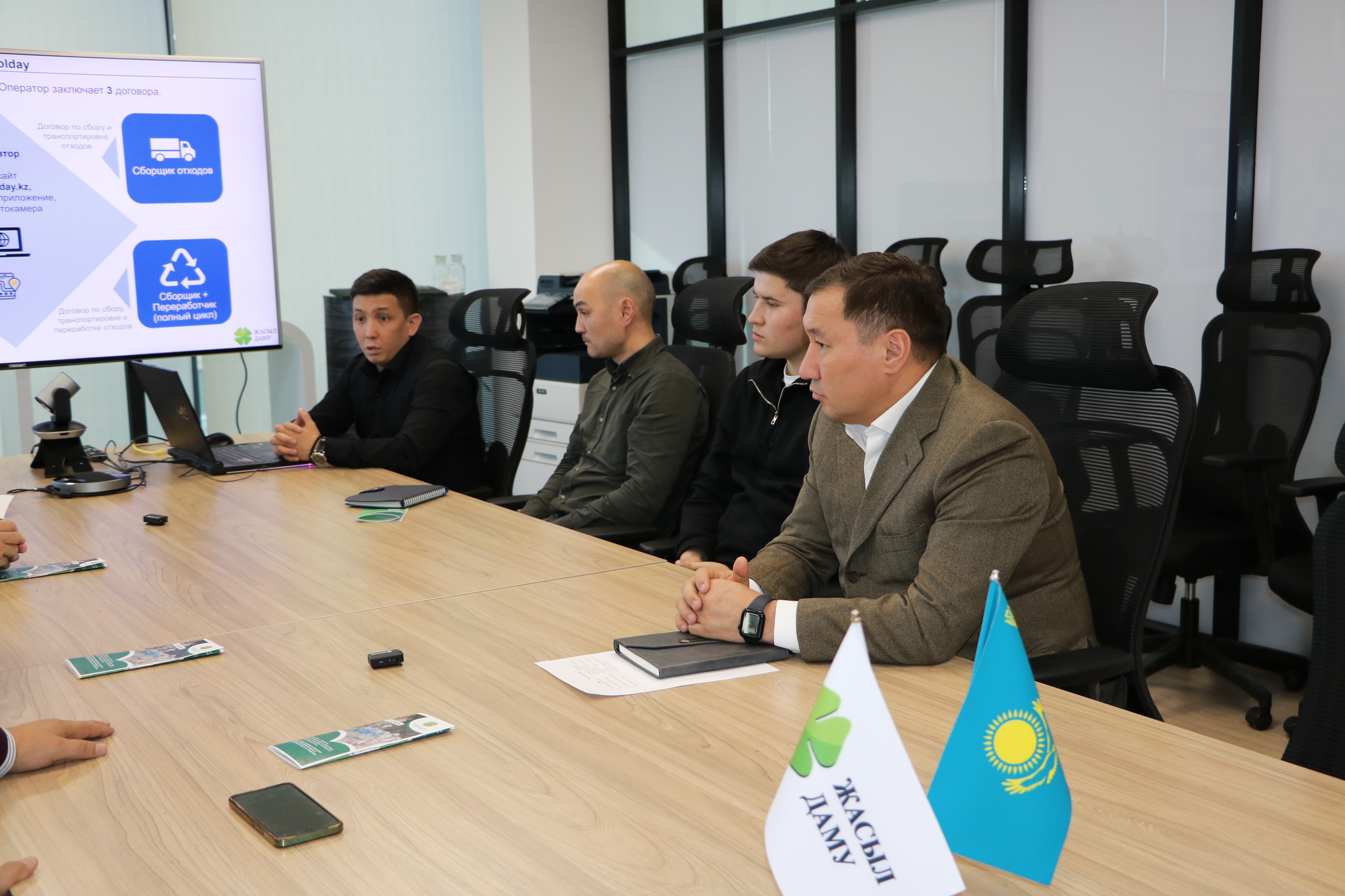 На площадке АО «Жасыл даму» c представителями Казахстанской ассоциации по управлению отходами «KazWaste», столичного филиала партии ОСДП, экспертного совета по вопросам ЖКХ и ОСИ, специализированных предприятий по сбору и переработке вторсырья в г. Астана состоялось рабочее совещание по вопросам вовлечения населения в систему раздельного сбора и сортировки вторичного сырья (макулатуры, стекла и пластика) через автоматизированную информационную систему (АИС) «EcoQolday».