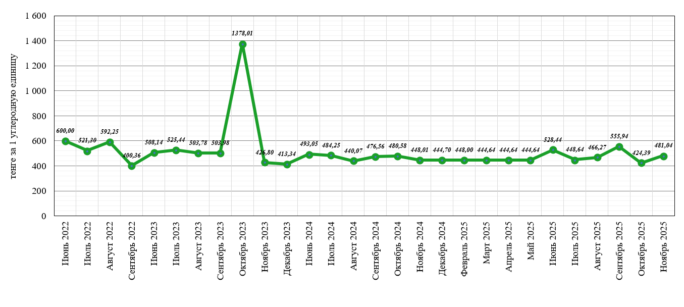 Среднемесячная цена внебиржевых сделок по купле-продаже углеродных единиц в 2025 году (в тенге за 1 углеродную единицу)
