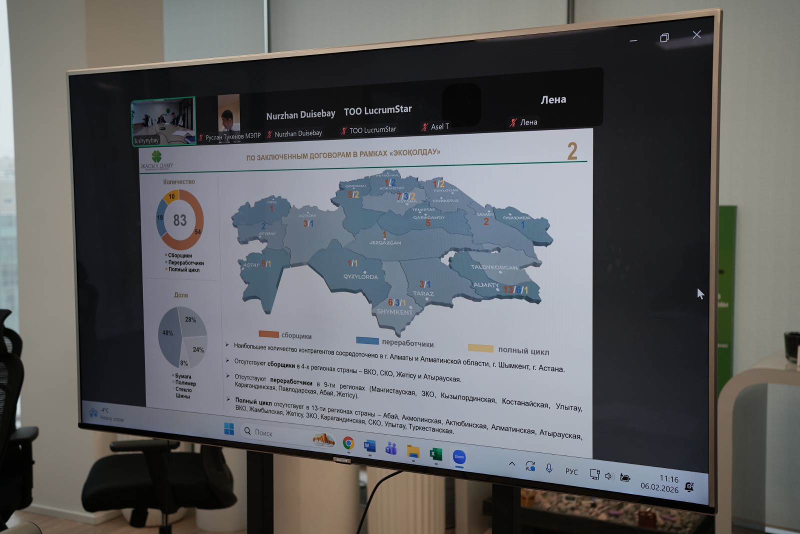 Совещание было посвящено подведению промежуточных итогов реализации программы, а также обсуждению планируемых изменений и дополнений в её механизмы. С докладом о ходе реализации программы «EcoQolday» выступил заместитель Председателя Правления АО «Жасыл даму» Кабдолданов Нуржан Кенесбаевич. О планируемых изменениях и дополнениях в программу проинформировал главный менеджер департамента по организации обращения с отходами АО «Жасыл даму» Шыныбай Бахтияр Жанибекулы.