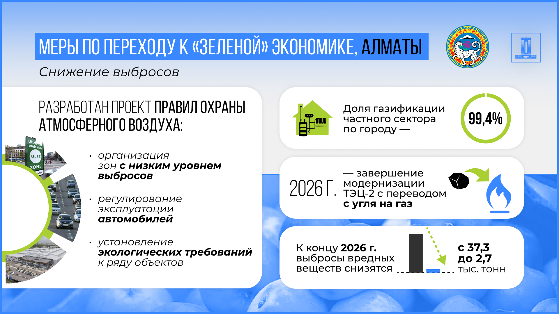 Аким Алматы Ерболат Досаев доложил Премьер-министру о реализации Плана мероприятий по переходу к «зеленой экономике». В числе приоритетных направлений работы – снижение загрязнения воздуха, развитие лесного фонда, эффективное использование водных ресурсов и управление отходами, внедрение ESG-принципов и выпуск «зелёных» облигаций.