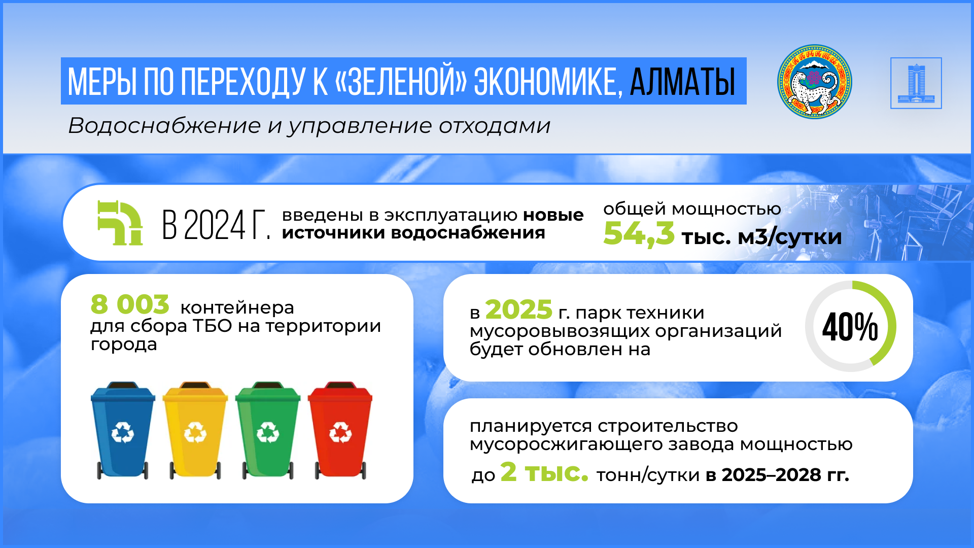 Для обеспечения качественного водоснабжения в 2024 году введены в эксплуатацию новые источники общей мощностью 54,3 тыс. м3/сутки. Также доложено о ходе модернизации инфраструктуры сбора ТБО, которую полностью планируется завершить в 2025 году. Аким Алматы Ерболат Досаев подчеркнул, что совместно с китайской компанией  Shanghai SUS Environment Co., Ltd планируется строительство завода по энергетической утилизации отходов мощностью до 2 тыс. тонн в сутки.