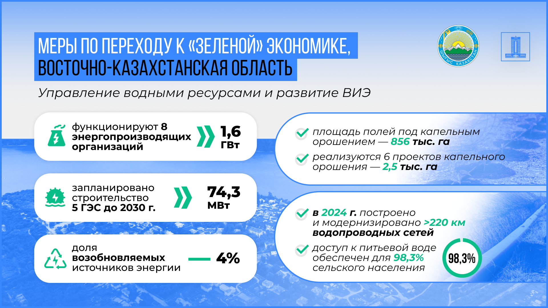 О принимаемых мерах по переходу к «зеленой экономике» доложил аким Восточно-Казахстанской области Ермек Кошербаев. В регионе до 2030 года запланировано строительство 5 ГЭС общей мощностью 74,3 МВт. На сегодня в области действуют 8 энергопроизводящих организаций мощностью 1,6 ГВт, возобновляемые источники энергии занимают 4% в общем объеме. Касательно управления водными ресурсами, на сегодня площадь полей под капельным орошением достигает 856 тыс. га. Для обеспечения стабильного водоснабжения населения в 2024 году из 26 проектов на 15,4 млрд тенге введено 11, по 15 проектам работы будут продолжены в 2025 году. Построено и модернизировано более 220 км водопроводных сетей, доступ к чистой питьевой воде обеспечен для 98,3% сельского населения.