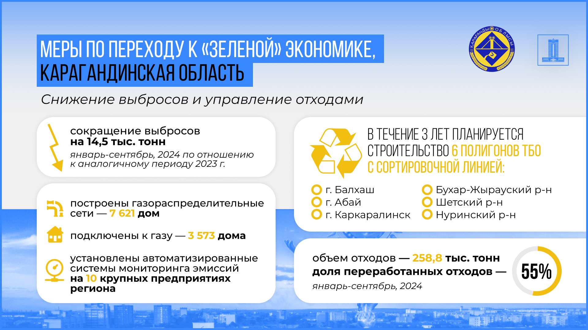 В Карагандинской области проводится планомерная работа по снижению выбросов. Аким Ермаганбет Булекпаев доложил, что по итогам 9 месяцев 2024 года. их количество сократилось на 14,5 тыс. тонн по сравнению с аналогичным периодом 2023 года. Продолжается газификация частного сектора. Построены газораспределительные сети для 7 621 дома, подключены 3 573 дома. На 10 крупных предприятиях региона установлены автоматизированные системы мониторинга эмиссий.