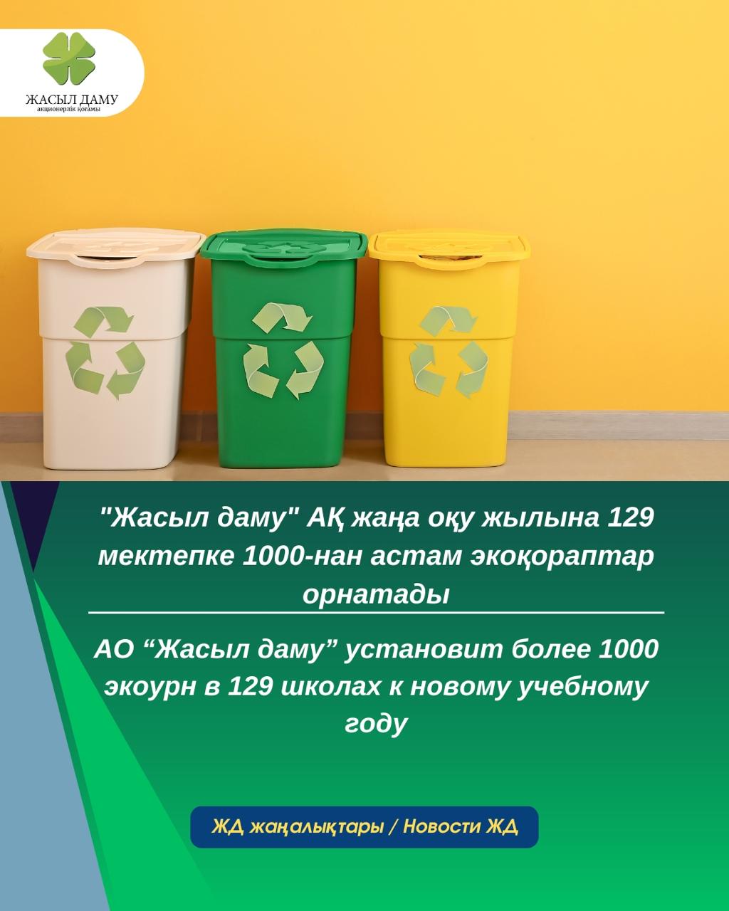 АО «Жасыл даму» продолжает экологическое просвещение молодежи: в 129-ти государственных школах Астаны и Жезказгана в течение лета установят 1095 комплектов современных эко урн, предназначенных для раздельного сбора отходов.